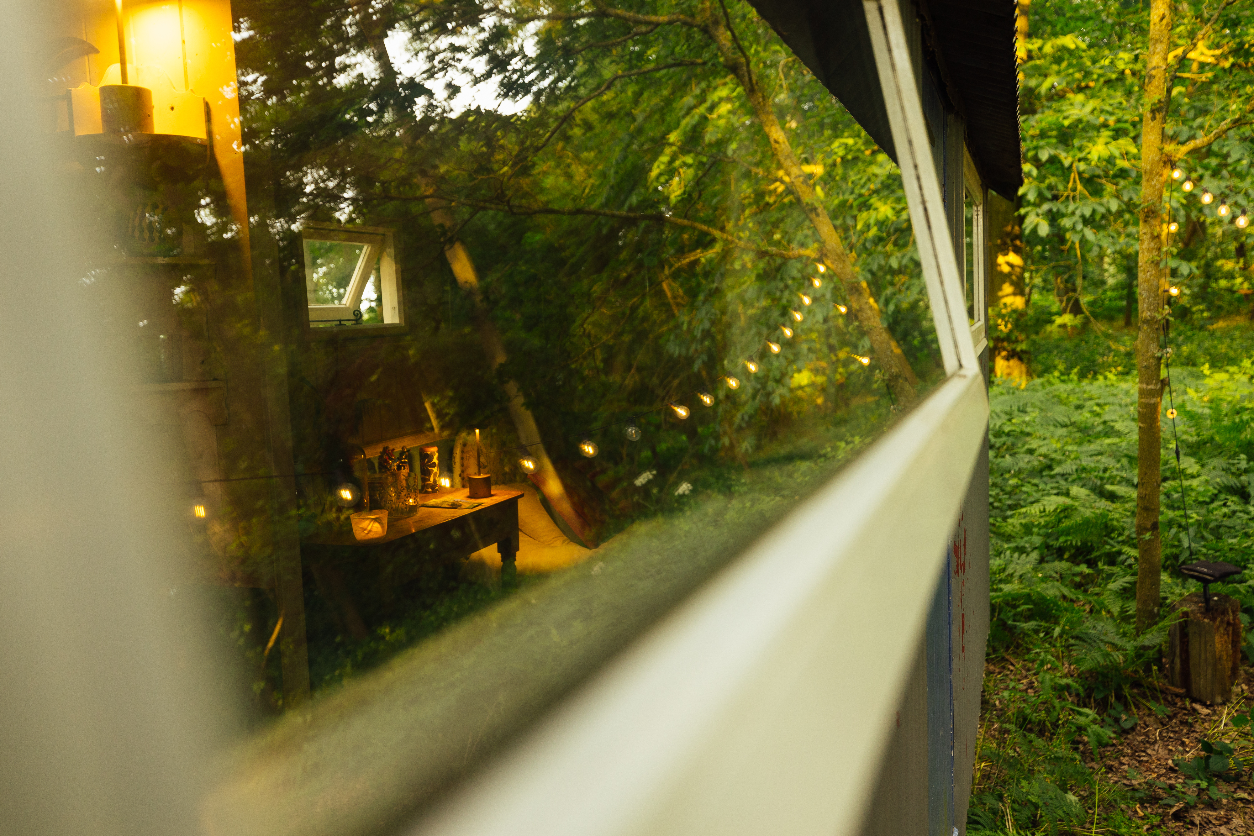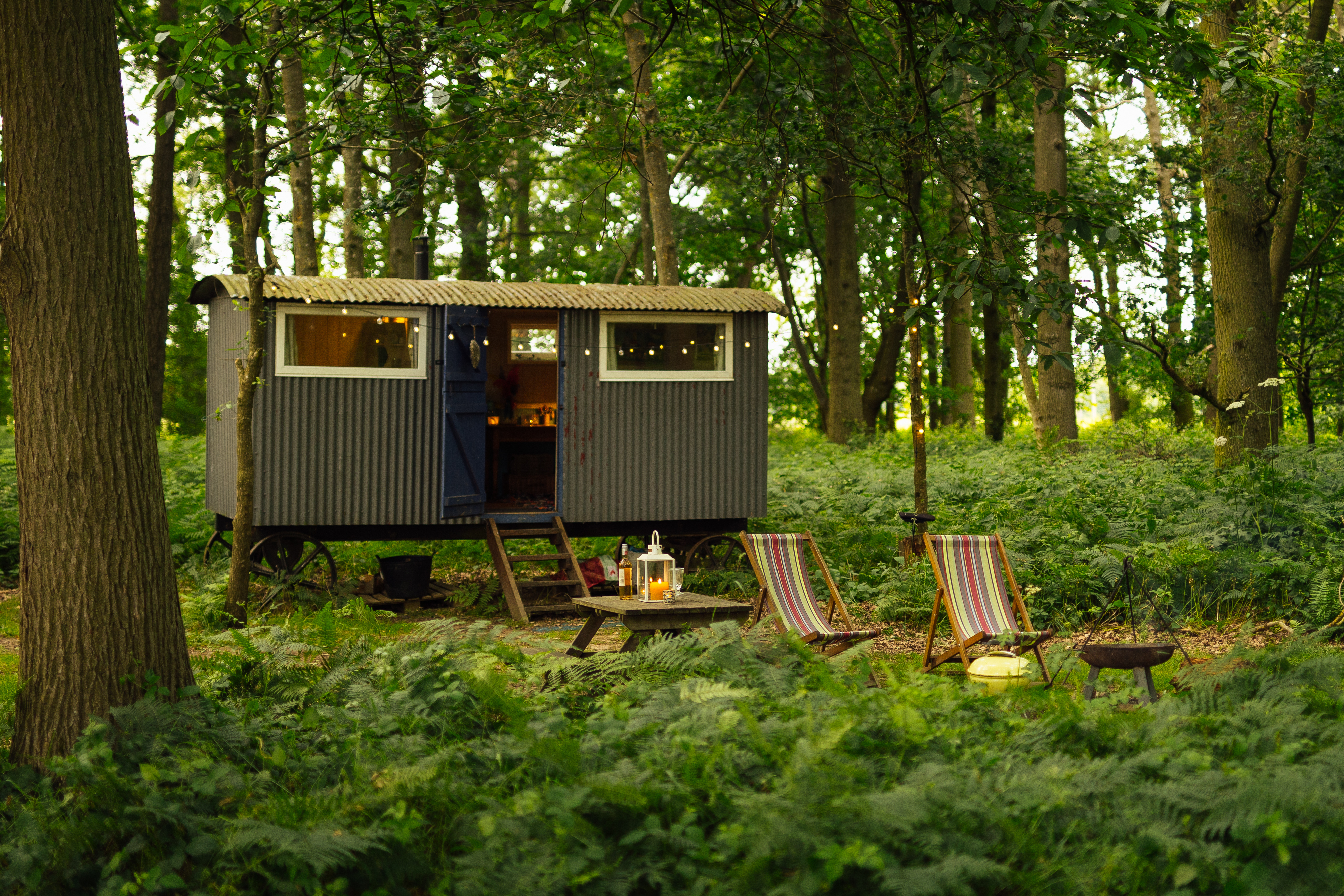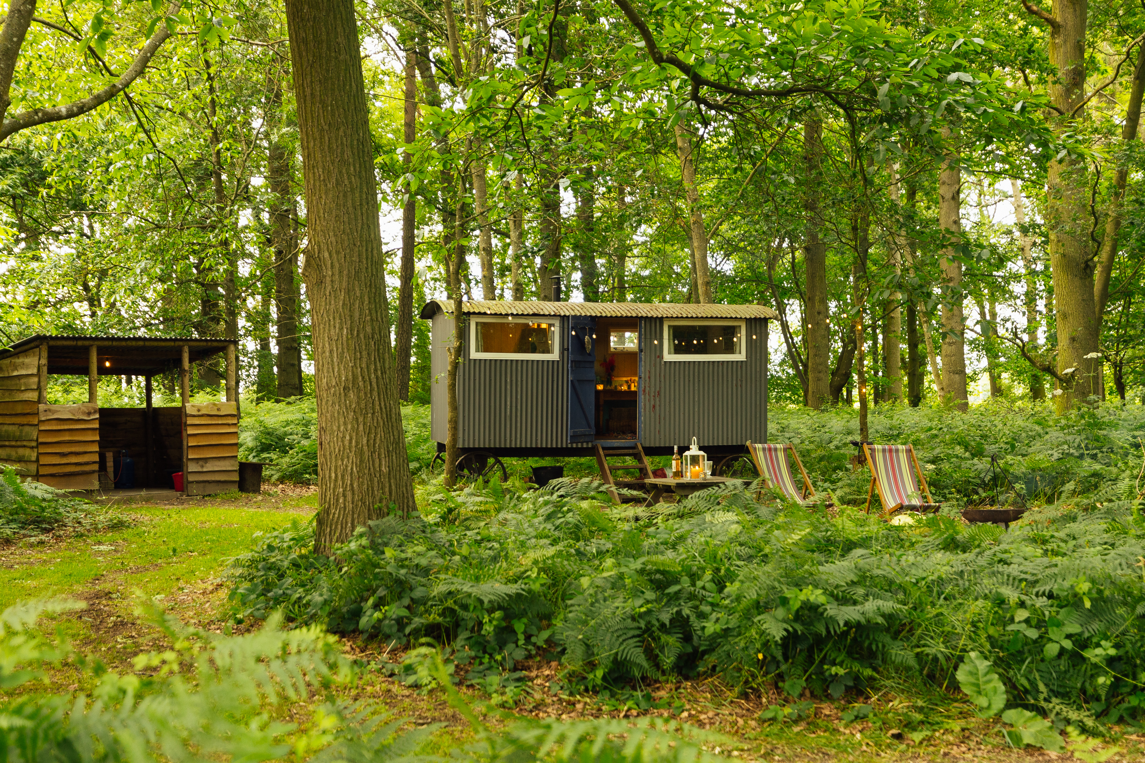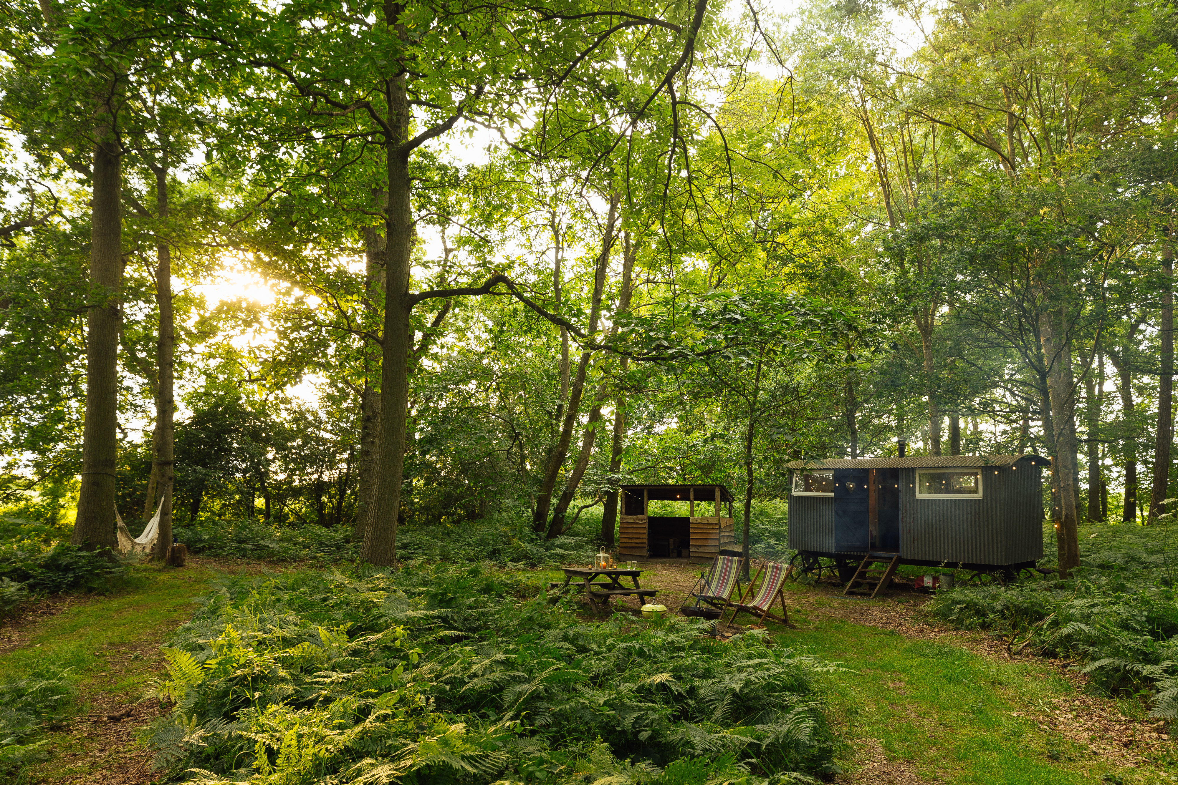 Tucked away in the ancient woodland, like a grown up festival version of a Famous Five hideout, our two whimsically retro boho-styled Shepherd Huts Lima and Posey, come with their own canopy space, all creature comforts, and camp kitchen.