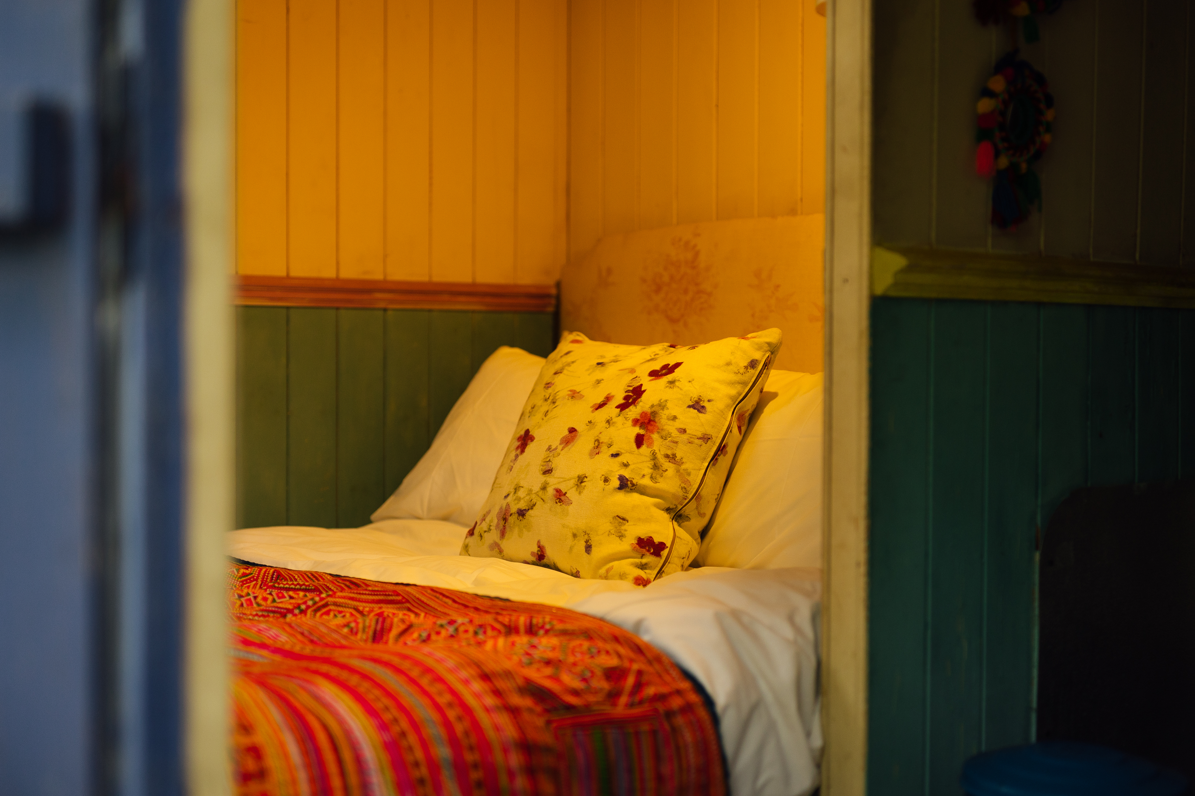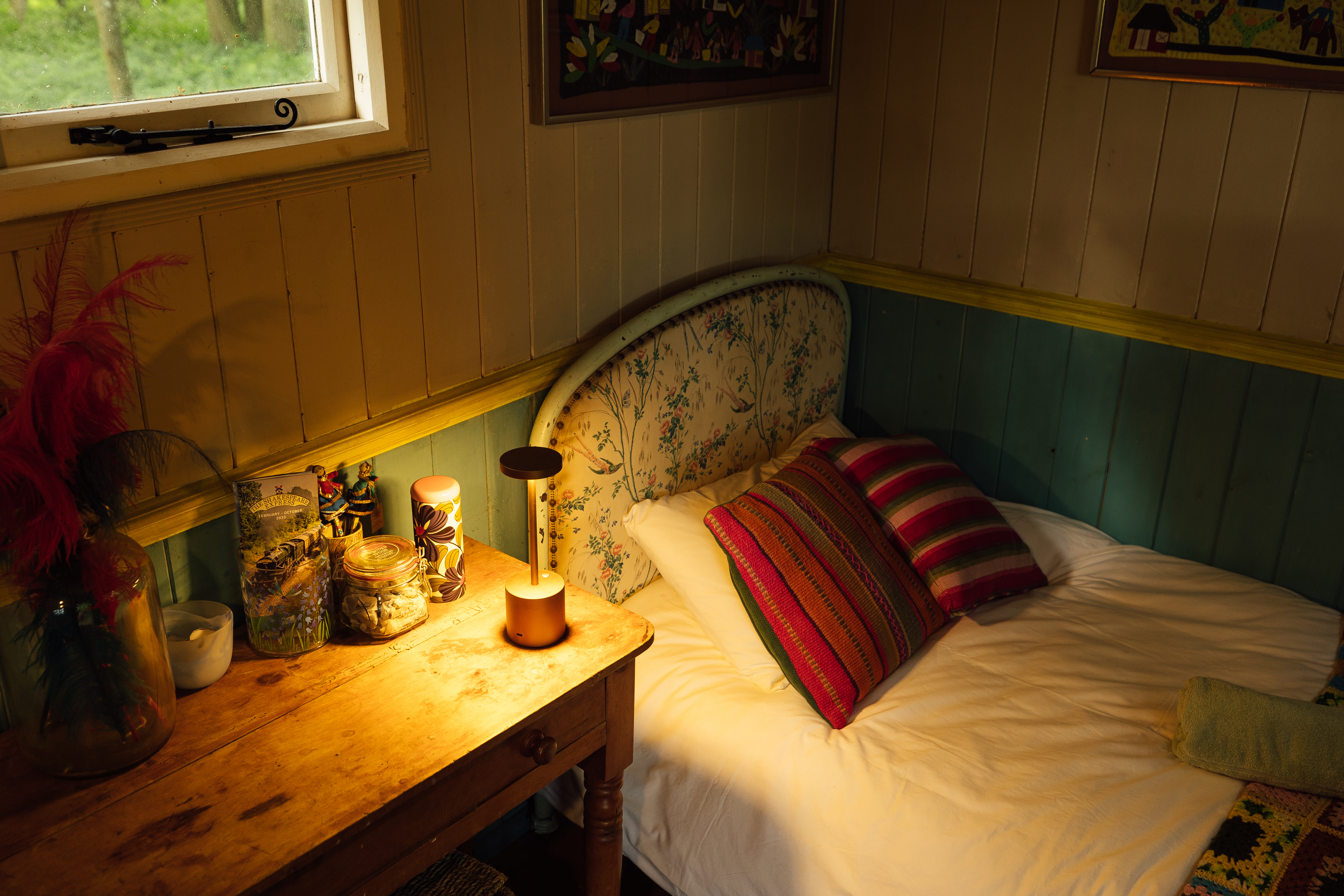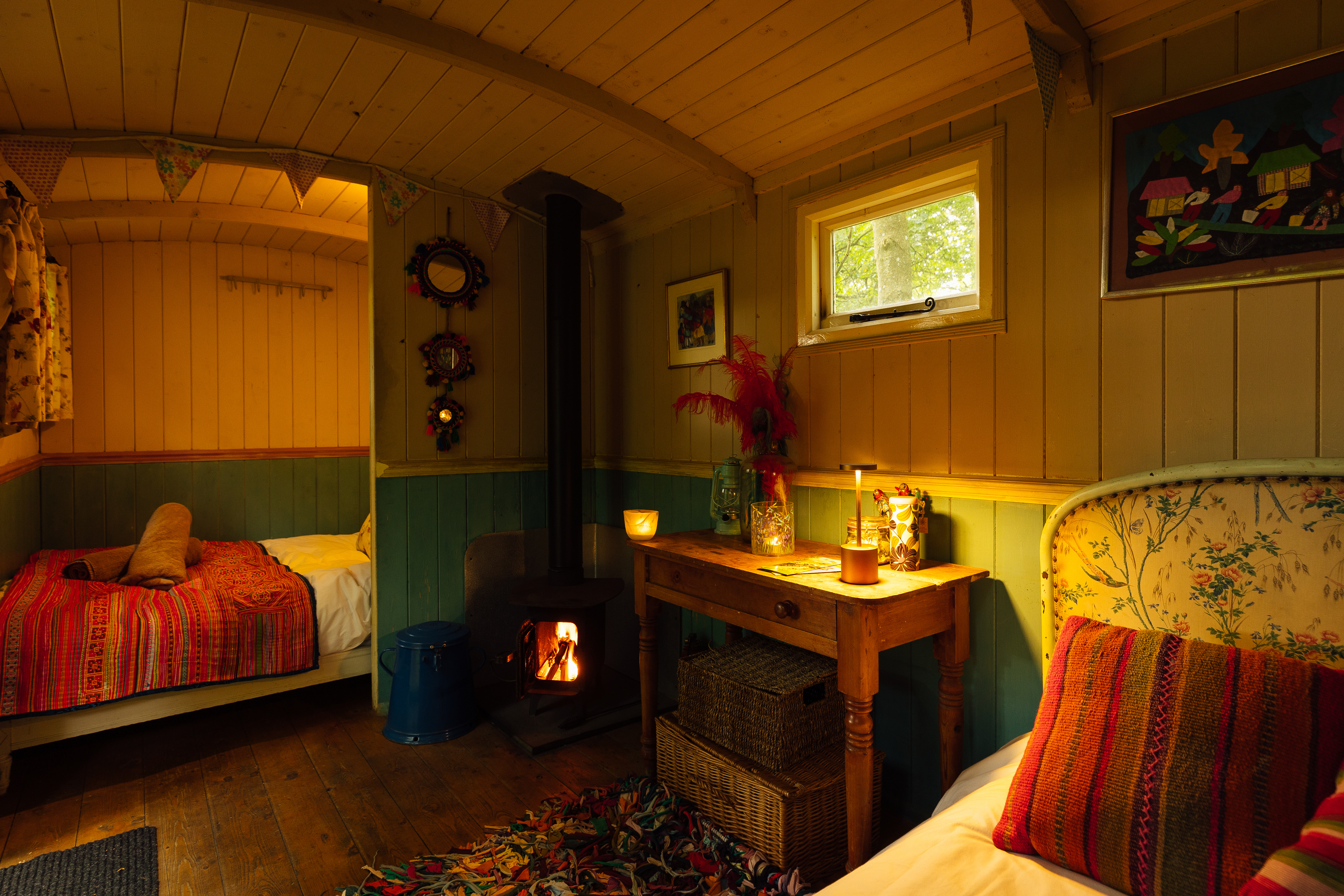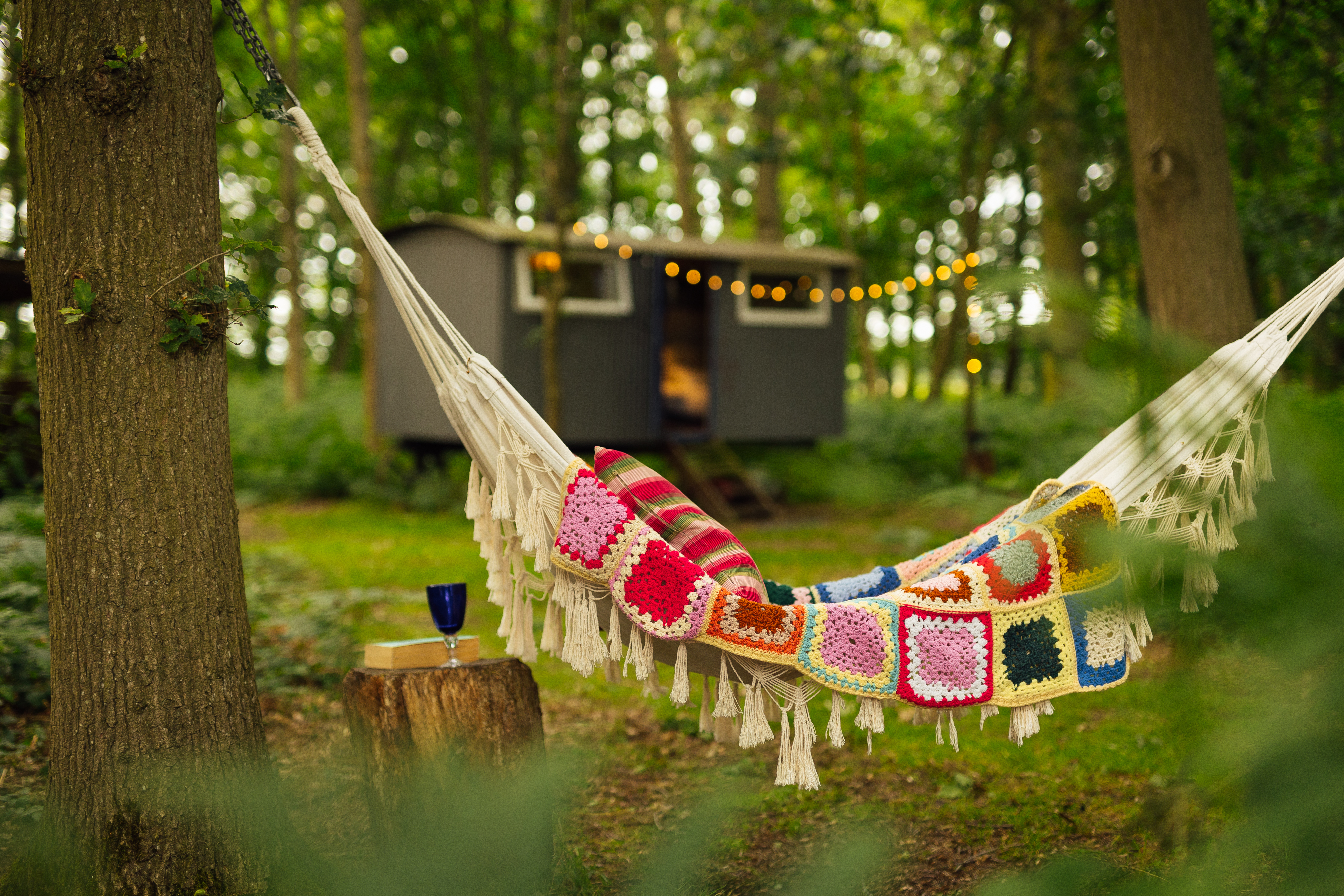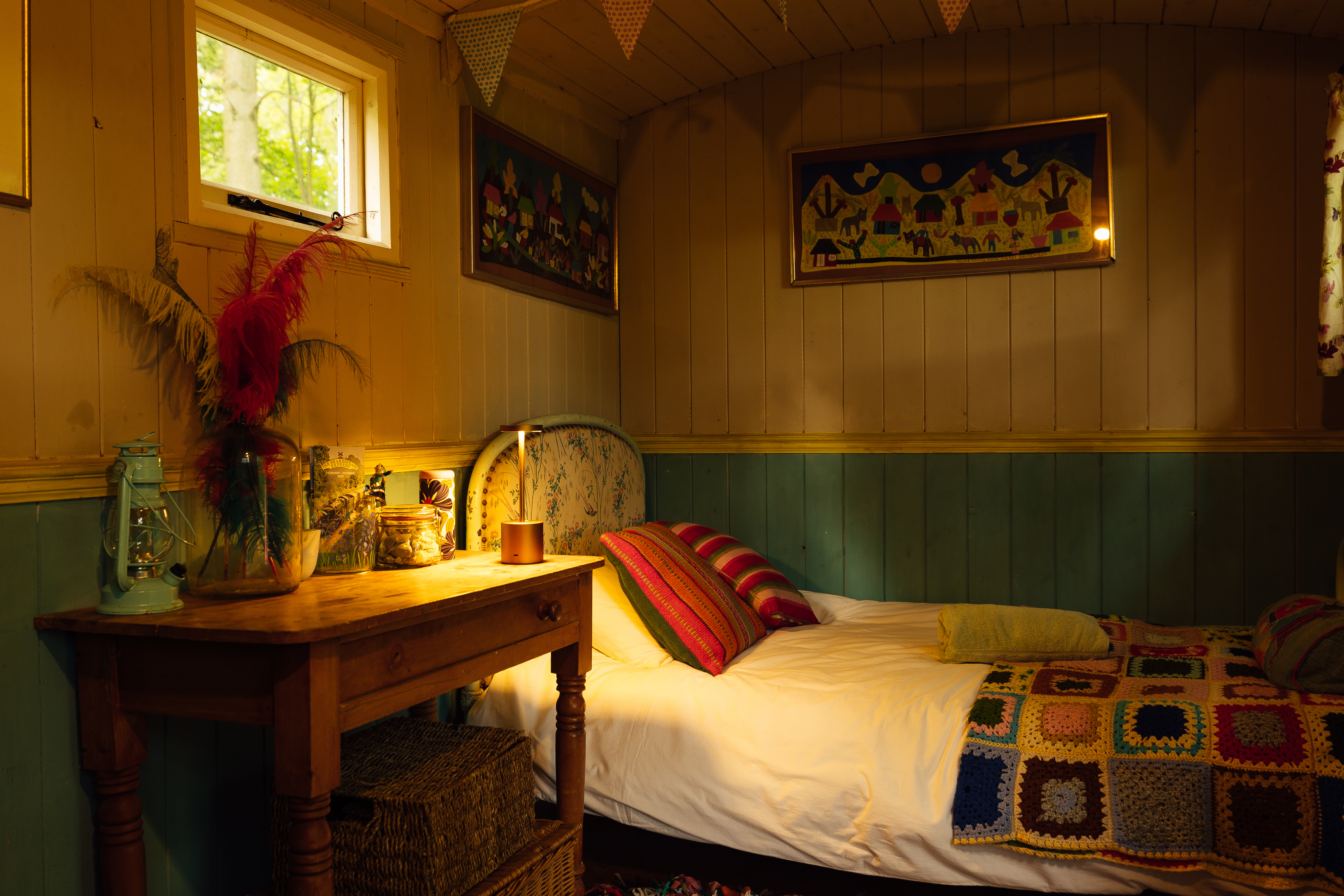 Lima is one of a pair of traditional shepherd’s huts, located in tranquil and very private ancient woodland, carpeted with bluebells in Spring and swathes of tall green ferns throughout the summer months.  Its colourful crocheted blankets, whimsical retro decor and all creature comforts include cooking herbs coffee tea make it the perfect getaway. If you’re looking to get away from it all, relax under a canopy of trees in enchanted woodland and immerse yourself in a vintage world with modern creature comforts, this is the spot. Magical fairy lights, tea lights and solar lighting make you feel as though you are sitting in an enchanted woodland setting around the campfire along with beautiful birdsong and the hooting of owls at night. Â