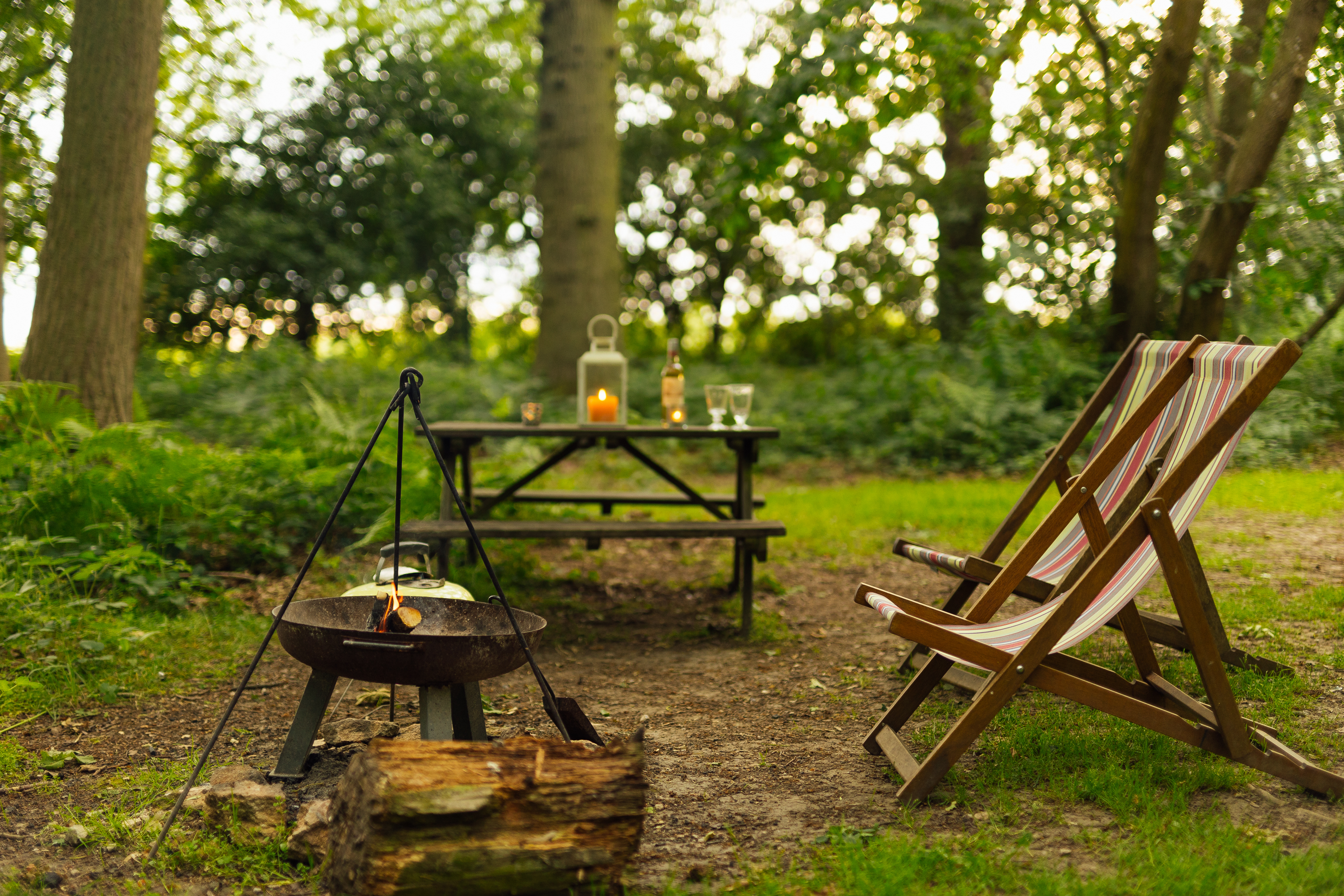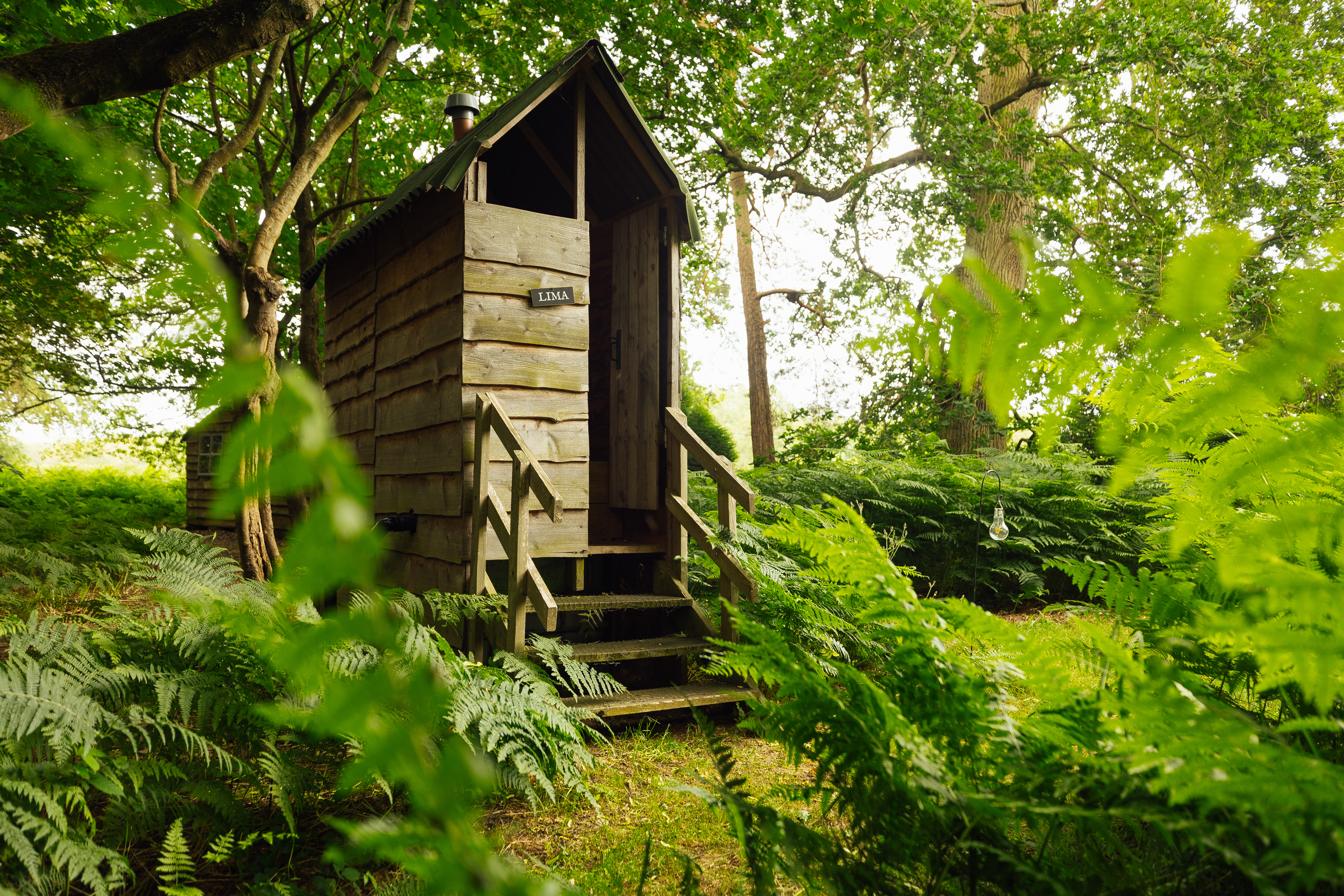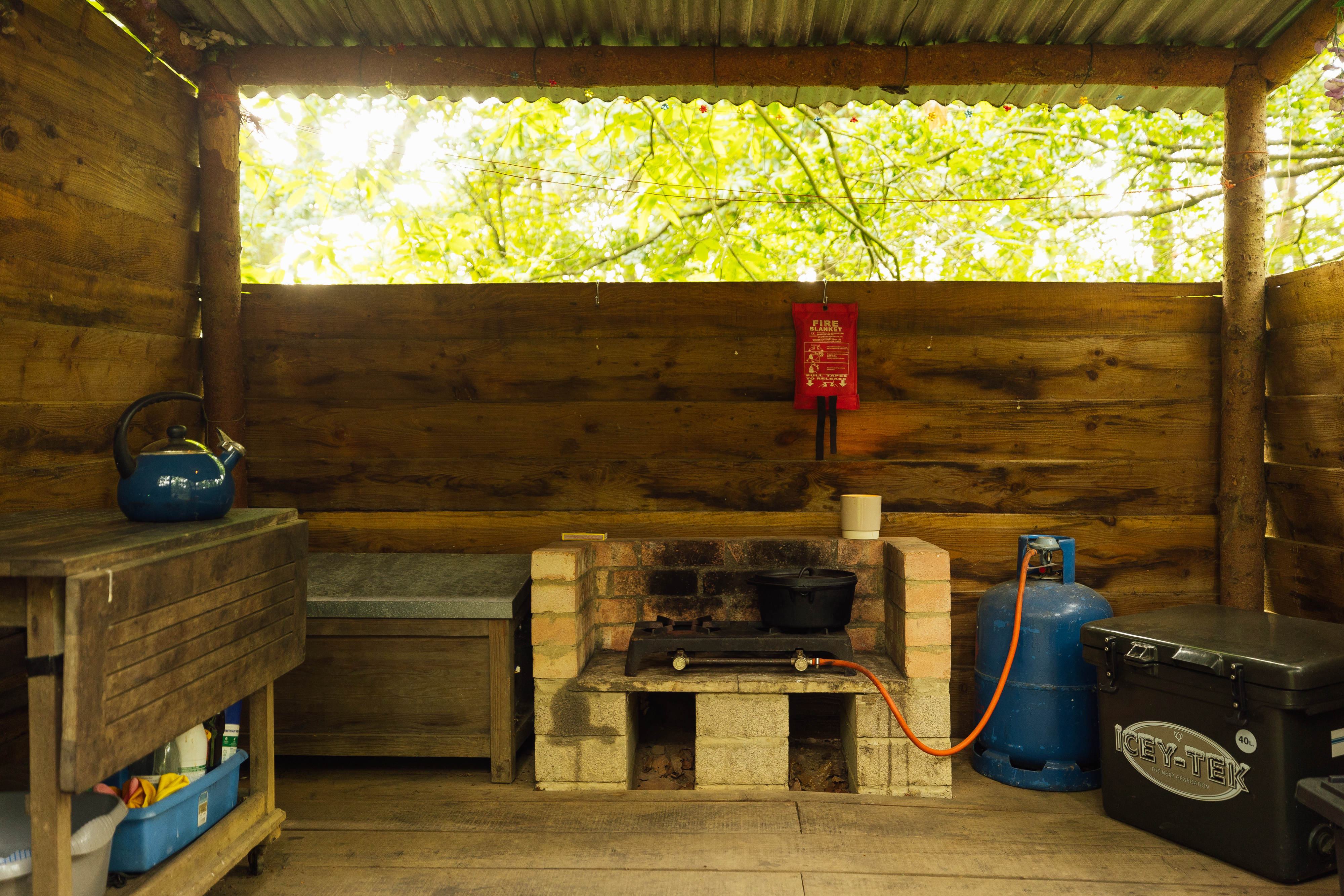 Each Hut has its own camp kitchen with mains water, coolbox, double gas hob ring and BBQ.  There’s also a fire pit with a tripod cooking pot if you feel like showing off your more advanced cooking skills. A short stroll through the wood takes you to Lima's composting loo, next to a shared outdoor safari shower - hot. Next to the shed with washing up facilities.