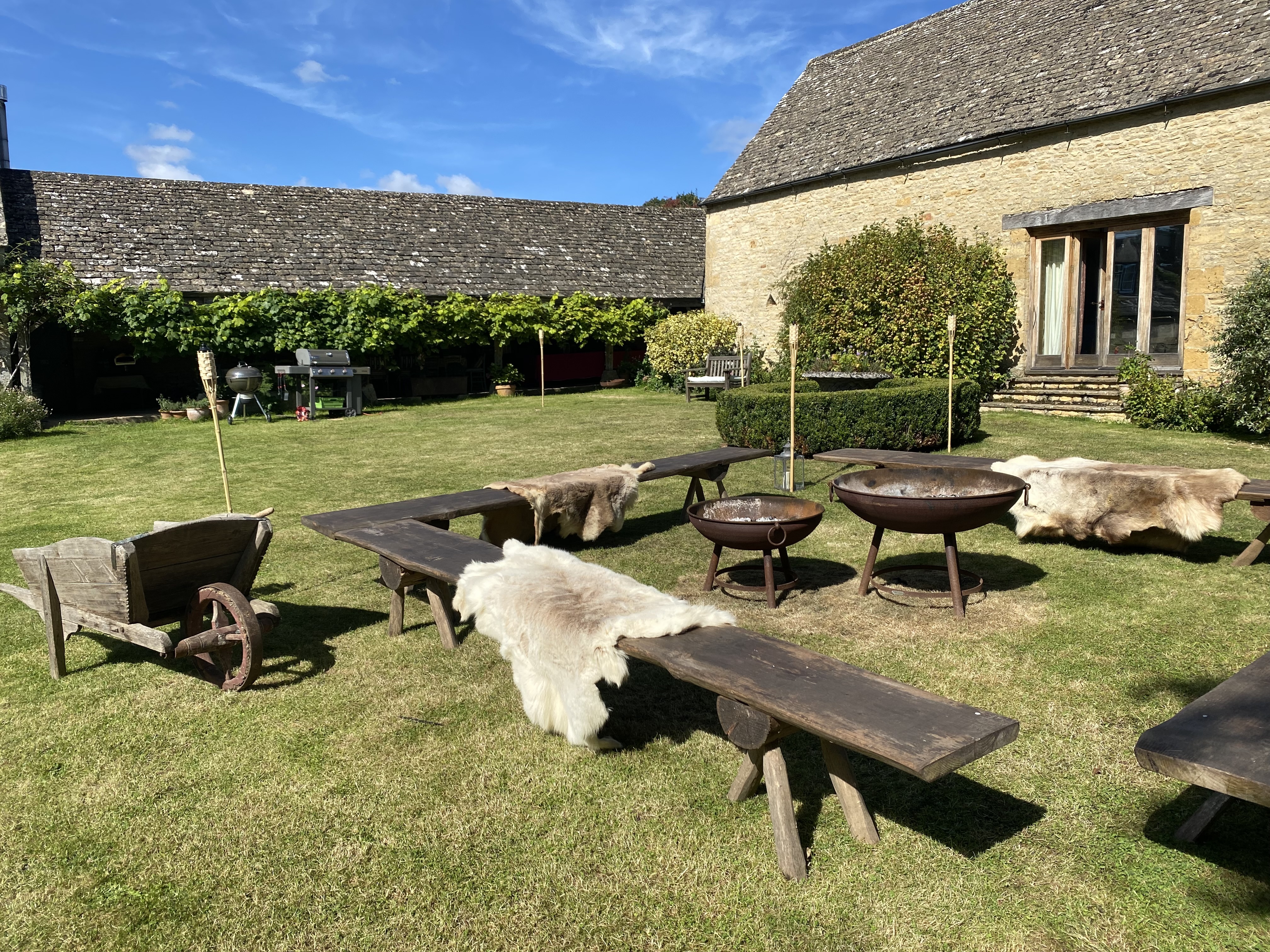 This area can also be hired instead of the main wedding field for small or large events. Two charming Cotswold lean to barns leading onto the Courtyard Garden together with the accommodation barn overlooking the glamping meadow and the wedding field.